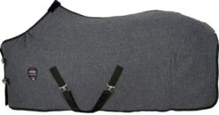 Comfortable and functional cooler rug in 100% acrylic with wool effect. Ideal as transport rug or after training as the material transports excess heat and sweat away from the horse. The rug has black binding, double front closure, detachable cross surcingles and elastic leg straps. Material:100% Acryllic with wool effect