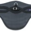 Specifically modified Dressage girth featuring an innovative round-shaped panel. The benefits are: it eliminates almost all lateral movements because the girth slides inside the special panel; the pressure is evenly distributed over a larger surface; the special shape of the panel, characterised by a round contour on the outside and three oval inserts inside, all made in extremely soft material, creates an air cushion to further reduce the pressure. Available with elastics on both sides.