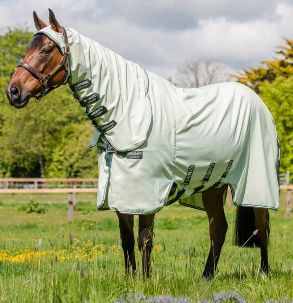 Integrated neck cover to go over ears for maximum coverage. V-Front closure for freedom of movement. Silky shoulder, mane and tail flap lining to avoid rubbing. Dual Leg Arches, three surcingles and extended belly protection. Supersized tail flap for added protection and tail strap.