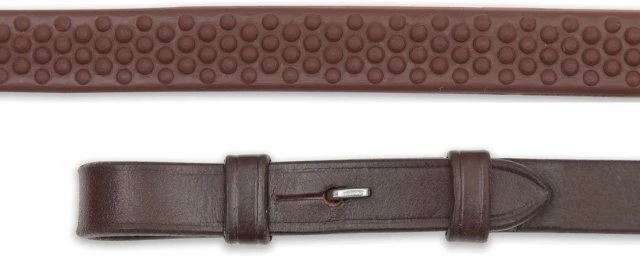 These reins feature rubber pimple grips with a softer, but no less effective grip. Hook stud billets and stainless steel fittings.